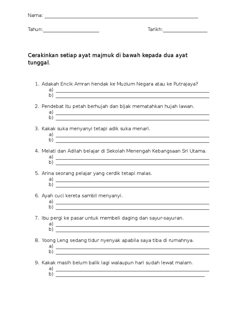 Cerakinkan Setiap Ayat Majmuk Di Bawah Kepada Dua Ayat Tunggal Pdf
